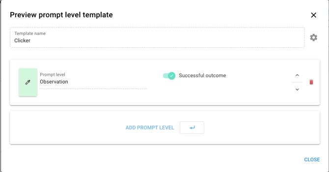On the data recording tab, choose a "Clicker" prompt level template. This will allow you to click once to record an instance of the behavior. Other prompt level templates can also be used if you would like to record different prompt levels!