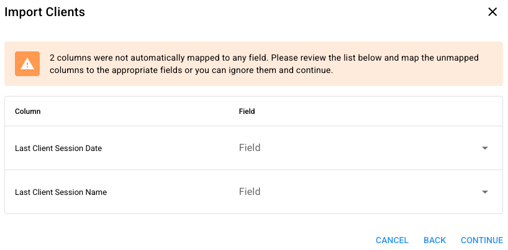 - If any column headers in your spreadsheet are not an exact match, you can choose to map the column to an existing field.