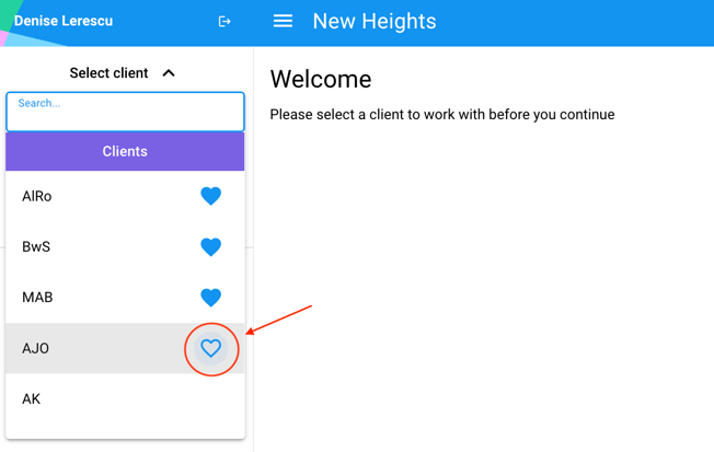 Users can favorite their clients (if they have access to more than 5 clients) in order to easily access the clients they most commonly work with.