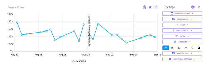 To ensure that your annotations, whether it's a phase-change line(s), trend line(s), and/or average(s), are present every time you view the graph, select the [purple star] icon on the top right of the graph area. This will save this graph setting for the the next time you view the graph. This is the setting that will always display moving forward unless you re-save a new view. The saved graph view will also always be what is pulled into your report if you are including graphs.