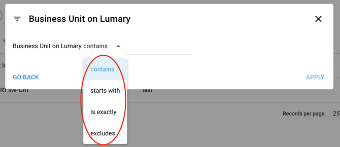 - select the [Add filter button] > select [Business Unit on Camber] > select to either include (contains, starts with, is exactly) or exclude and type out the Business Unit on Camber > select apply