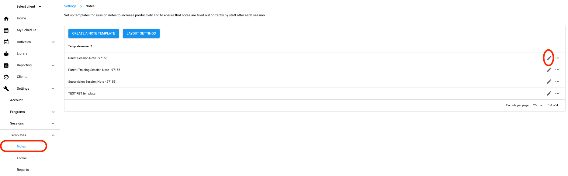2. Select the pencil icon to edit the note template you wish to add appointment-specific information to.