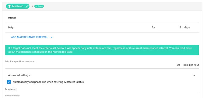 - Select [Advanced settings...] to automatically add a phase change line when a target automatically moves into [Mastered]. The default name will be Mastered, but you can change it if necessary.
