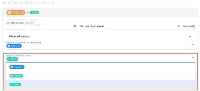 - What will happen with the target if mastered: a target can be [closed] (meaning it won't appear in the session again), it can be [mastered] (meaning you can set a maintenance schedule) or it can go to [acquisition].