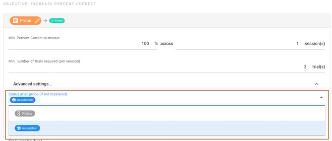 - What will happen with the target if it is not mastered: If not mastered, a target can either go to a [waiting] status (meaning it will not be worked on until opened) or to an [acquisition] status(meaning it will be worked on for continued teaching)