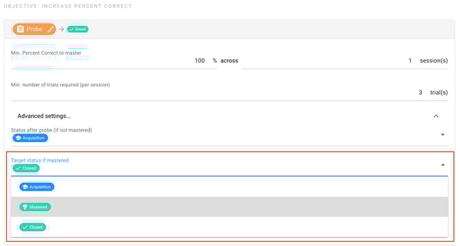 - What will happen with the target if mastered: a target can be [closed] (meaning it won't appear in the session again), it can be [mastered] (meaning you can set a maintenance schedule) or it can go to [acquisition].