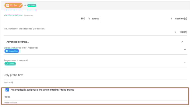 - For the [Probe] section, add the percent correct for mastery and minimum number of trials per session across the total number of sessions in order to consider the target mastered.