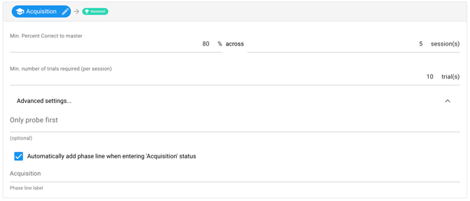 - For the [Acquisition] phase, add the percent correct for mastery and the minimum number of trials required per session across the number of sessions in order to consider the target mastered.