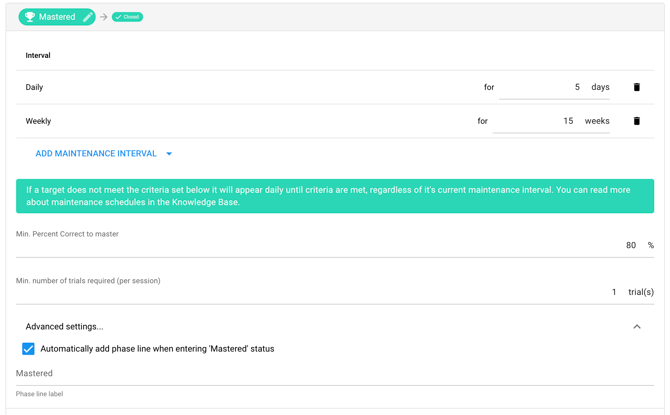 - Select [Advanced settings...] to automatically add a phase change line when a target automatically moves into [Mastered]. The default name will be Mastered, but you can change it if necessary.