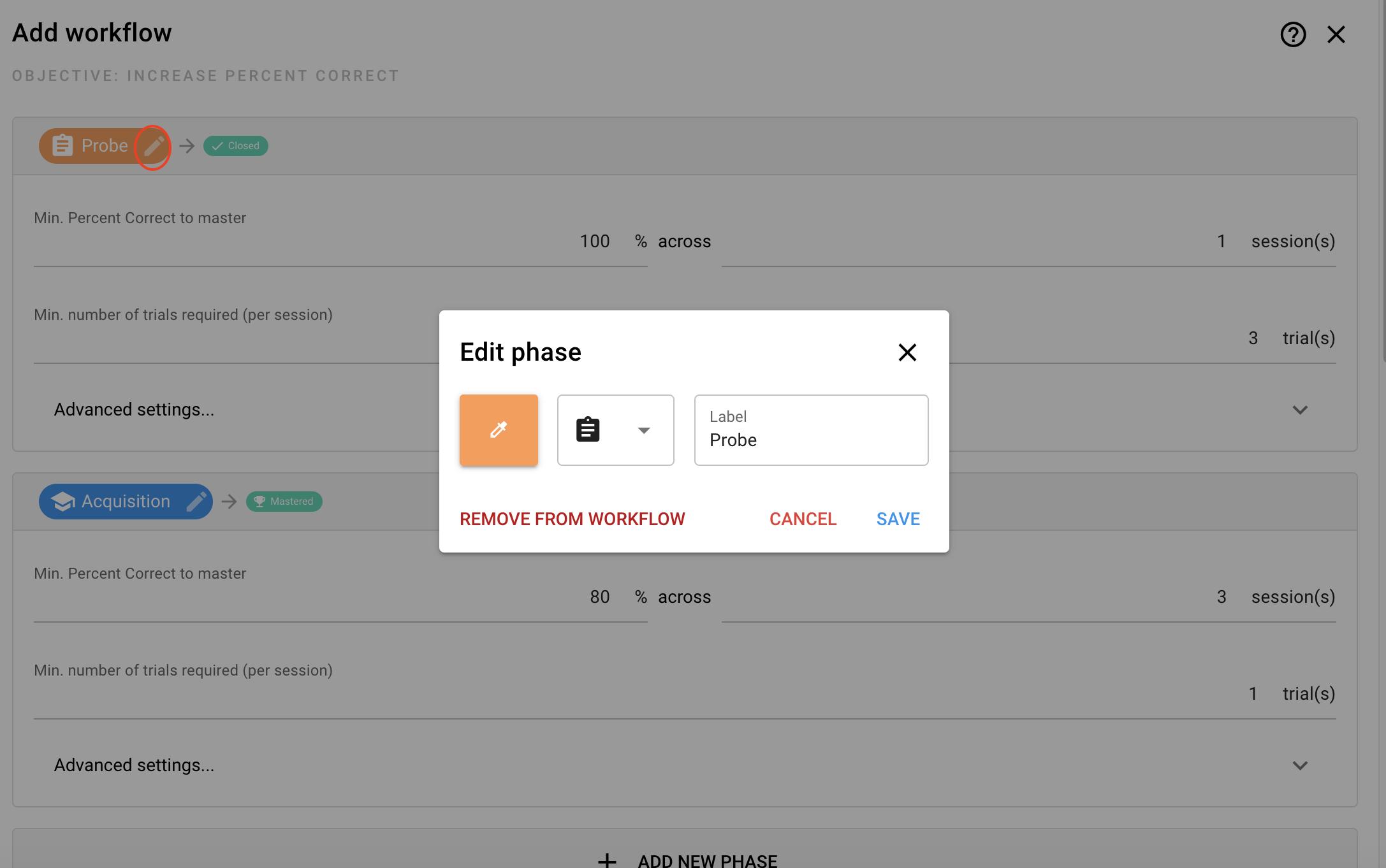 This phase is optional- it can be removed from a workflow and/or re-named by selecting the pencil icon to the right of [probe].
