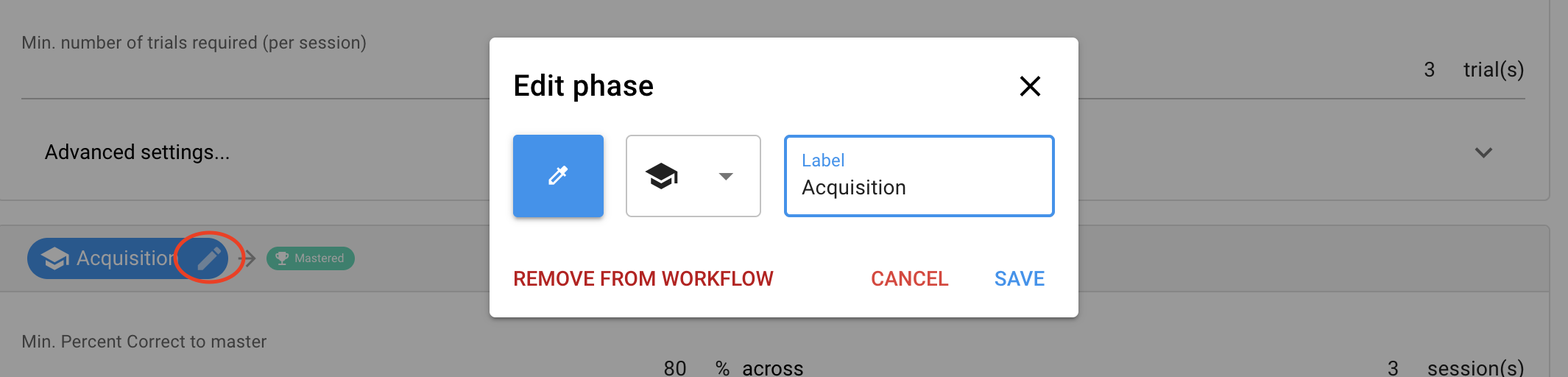 This phase is optional- it can be removed from a workflow. Additionally the name, color, and icon can be modified by selecting the pencil icon to the right of [Mastered]