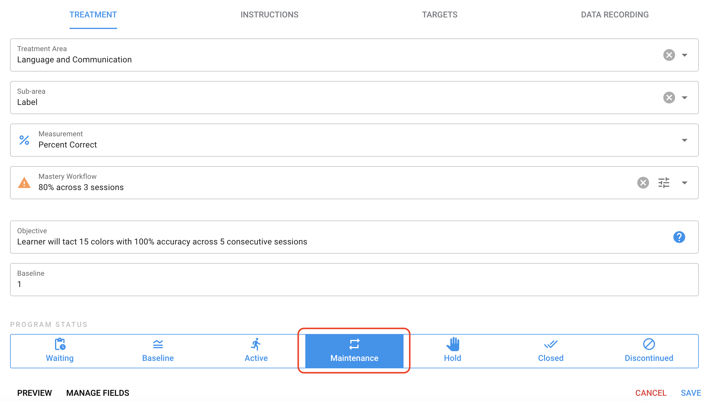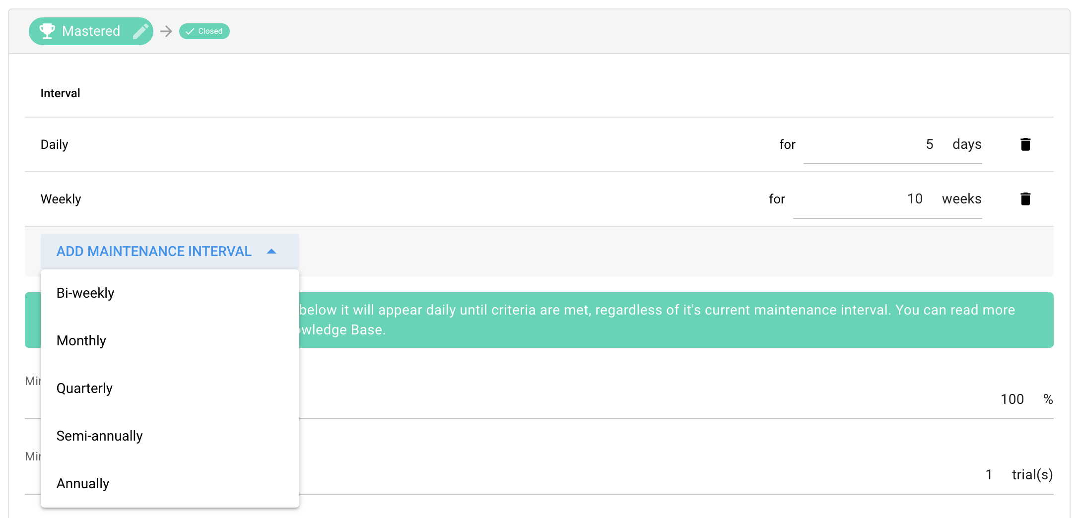 The target will only move onto the next maintenance interval so long as it has reached the criteria set up below. Once a target runs through the whole maintenance interval schedule, then the target will transition to closed. Please be sure to at least select a minimum count (trial, frequency, rate, or duration) before saving your workflow.