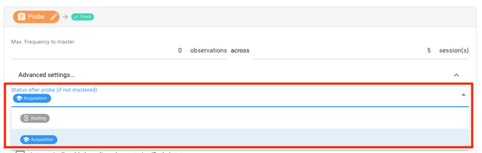 - What will happen with the target if mastered: a target can be [closed] (meaning it won't appear in the session again), it can be [mastered] (meaning you can set a maintenance schedule) or it can go to [acquisition].