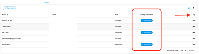 7. To ensure all users are connected to their Lumary profile select the gear icon on the User page and add the column [Lumary connection].
