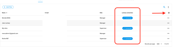 6. To ensure all users are connected to their Lumary profile select the gear icon on the User page and add the column [Lumary connection].