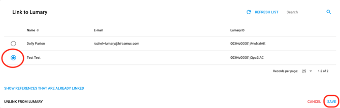 6. Select the bubble next to the user you wish to link them to from the list of Lumary profiles and select [Save]