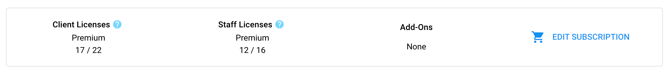 At the top of the page, you will see the Client License type (Standard or Premium), how many Client Licenses you have and how many are being used. Under Staff Licenses, you will see how many Licenses you have and how many are being used.