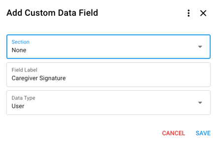 2. Select the [Add Data Field] button.3. Select a section you would like the data field be be held within, or can continue with ‘none’