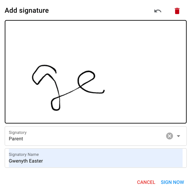 - Select the parents name from the dropdown who you would like to associate with the signature.