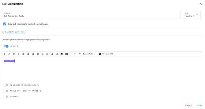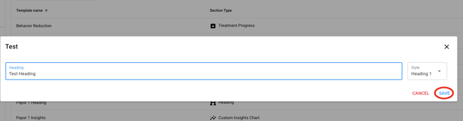 - Once saved, your Heading section template becomes available in the list of Template Sections and as an option when building a Report Template.