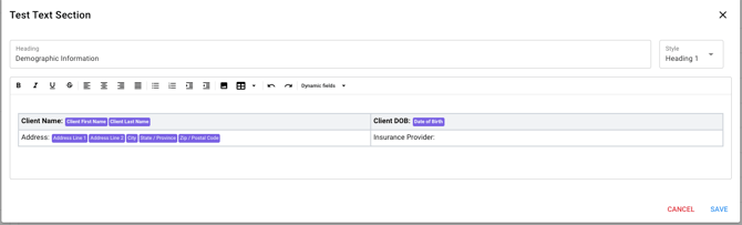 - Add any text, dynamic fields, tables, etc. you would like to serve as guide for your clinicians when completing this section.