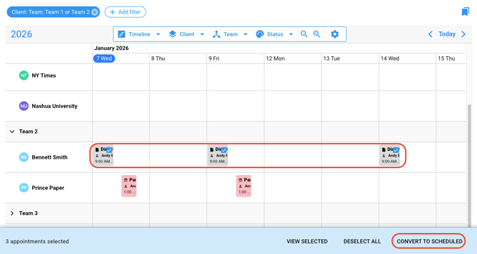 - [Convert to scheduled] successfully updates all selected appointments to Scheduled status