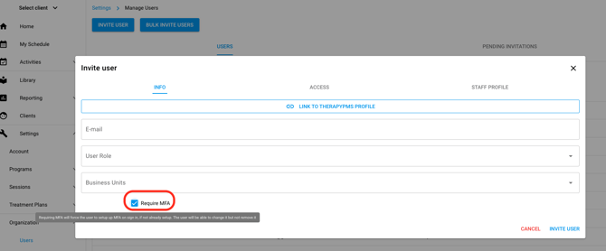 a. If inviting a single user, fill out their email and user role type, then check the box for [Require MFA]. Select [Invite User]