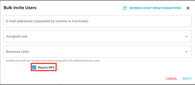 b. If inviting users in bulk, enter the email addresses separated by a comma or a line break, select the assigned role and check the [Require MFA] box.