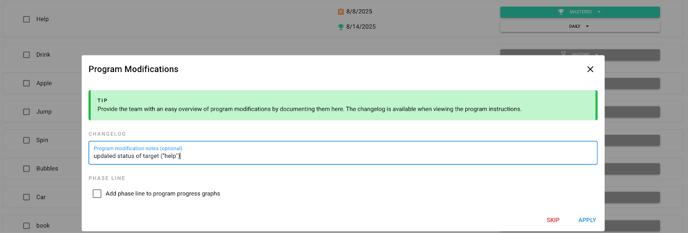 4. Click to make program modifications; edit instructional notes, update videos or digital materials, add, remove, or update targets to reflect in the changelog.