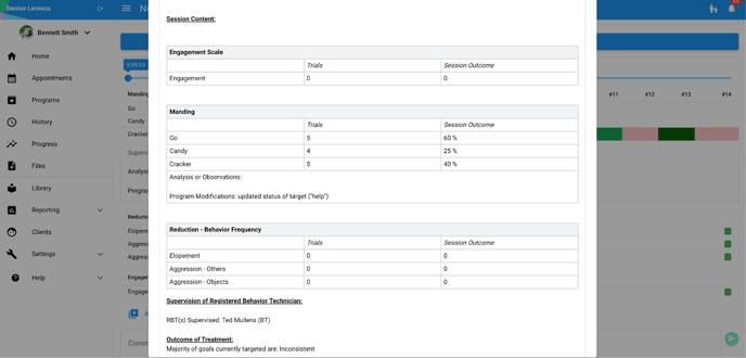 - 5. Once you have completed your supervision session, click [Finish Session]. The client's data summary will pull into your supervision note (as seen below):