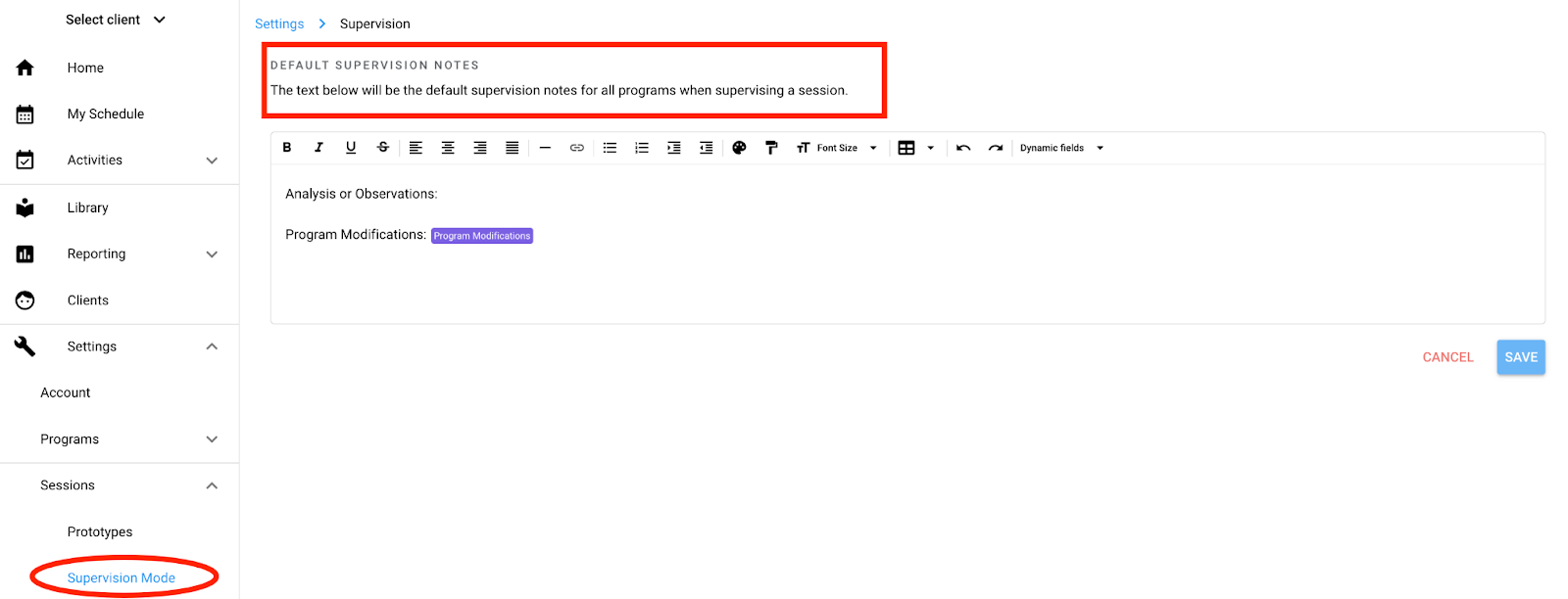 Note: This supervision note template will be the default supervision notes for all programs when supervising all client's sessions across your organization in supervision mode.