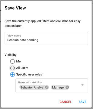 3. Name your view and choose your visibility settings. Each view can be visible to just you, all users, or specific user roles. Note: only Manager-level users can save shared views